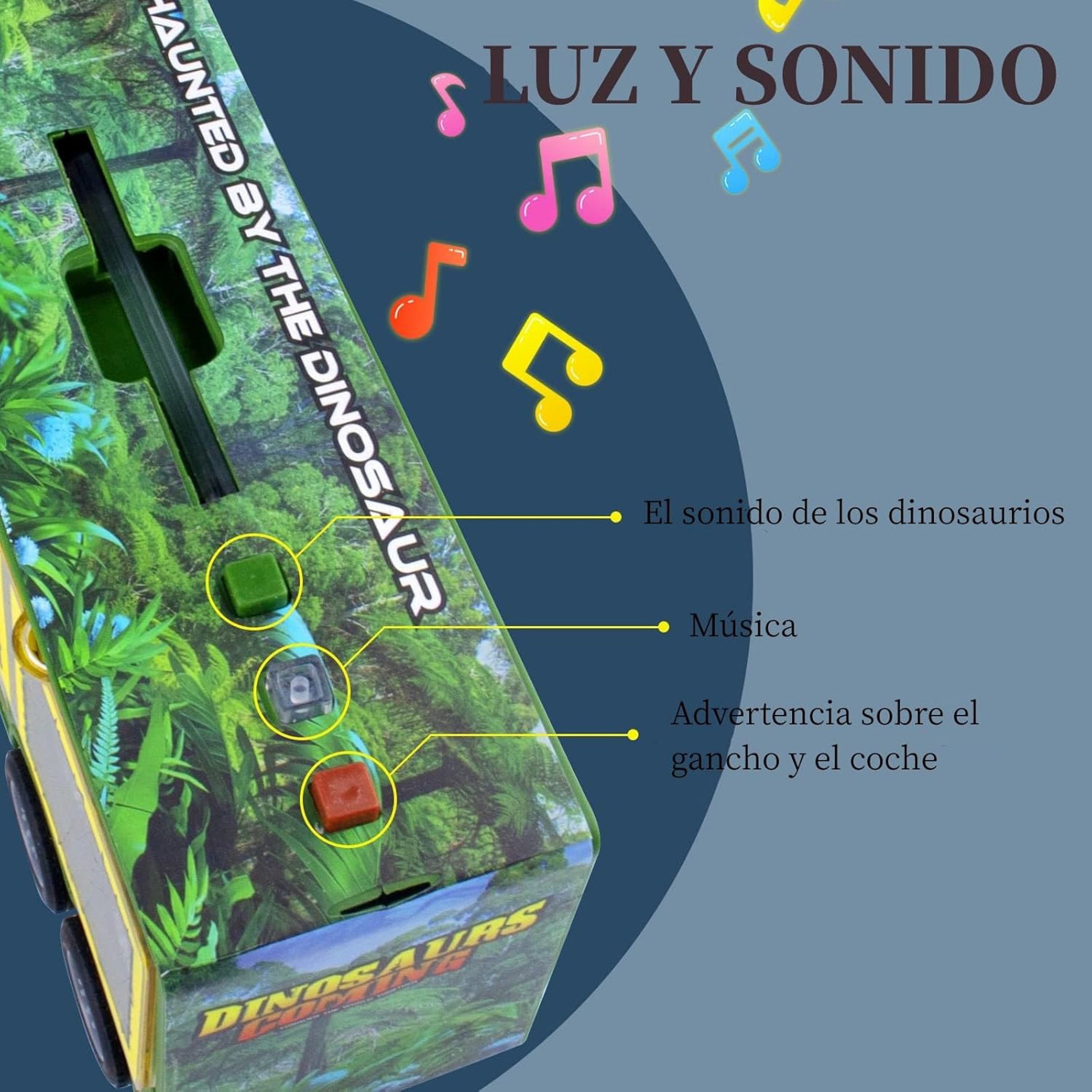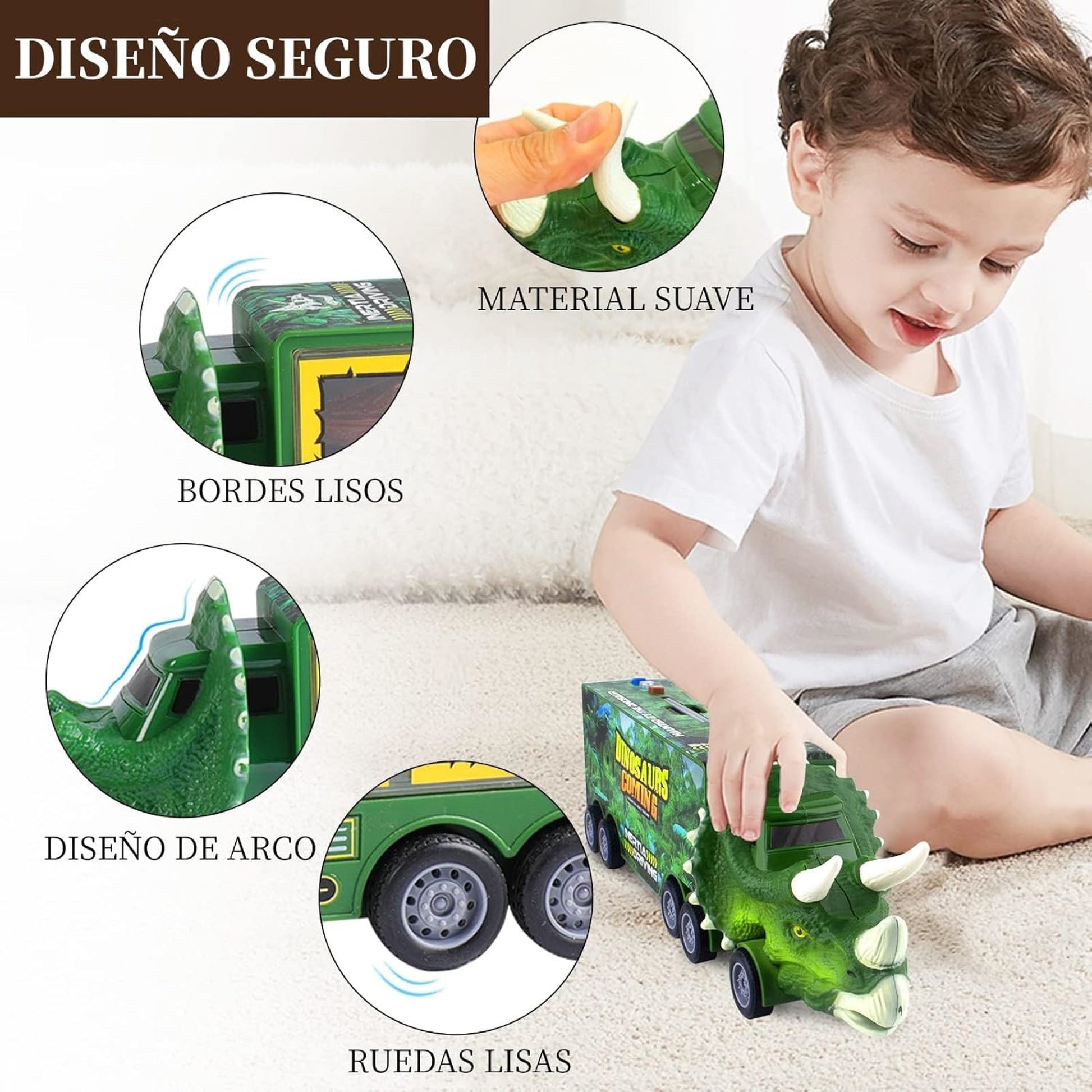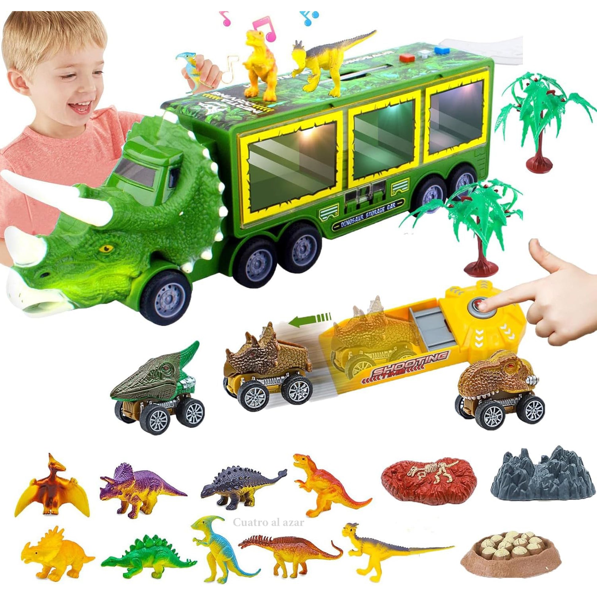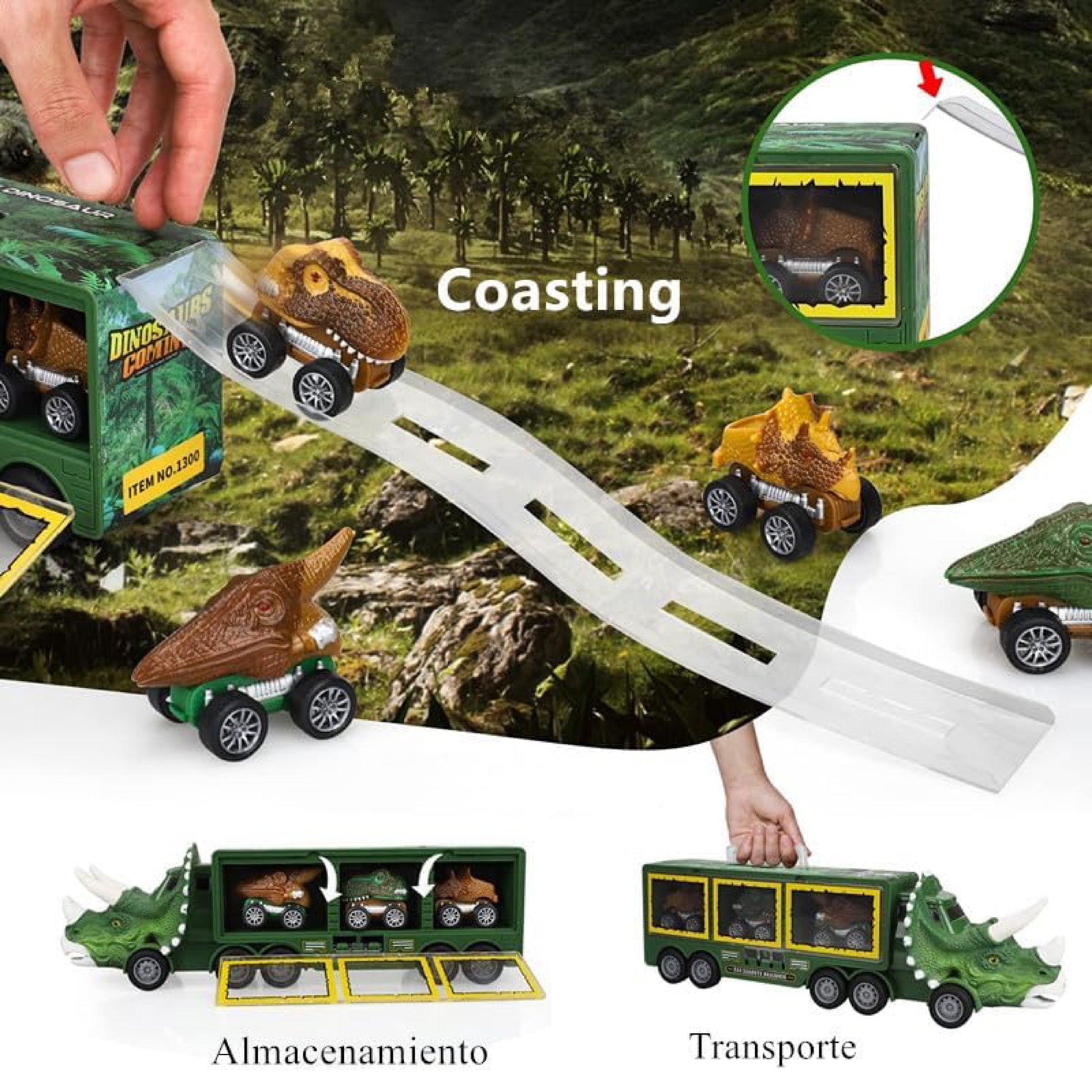 - Contiene 1 camión grande, 3 mini coches de carreras de dinosaurios, 3 dinosaurios, 1 huevo de dinosaurio, 1 fósil de dinosaurio, 2 árboles, 1 pista y 1 lanzador