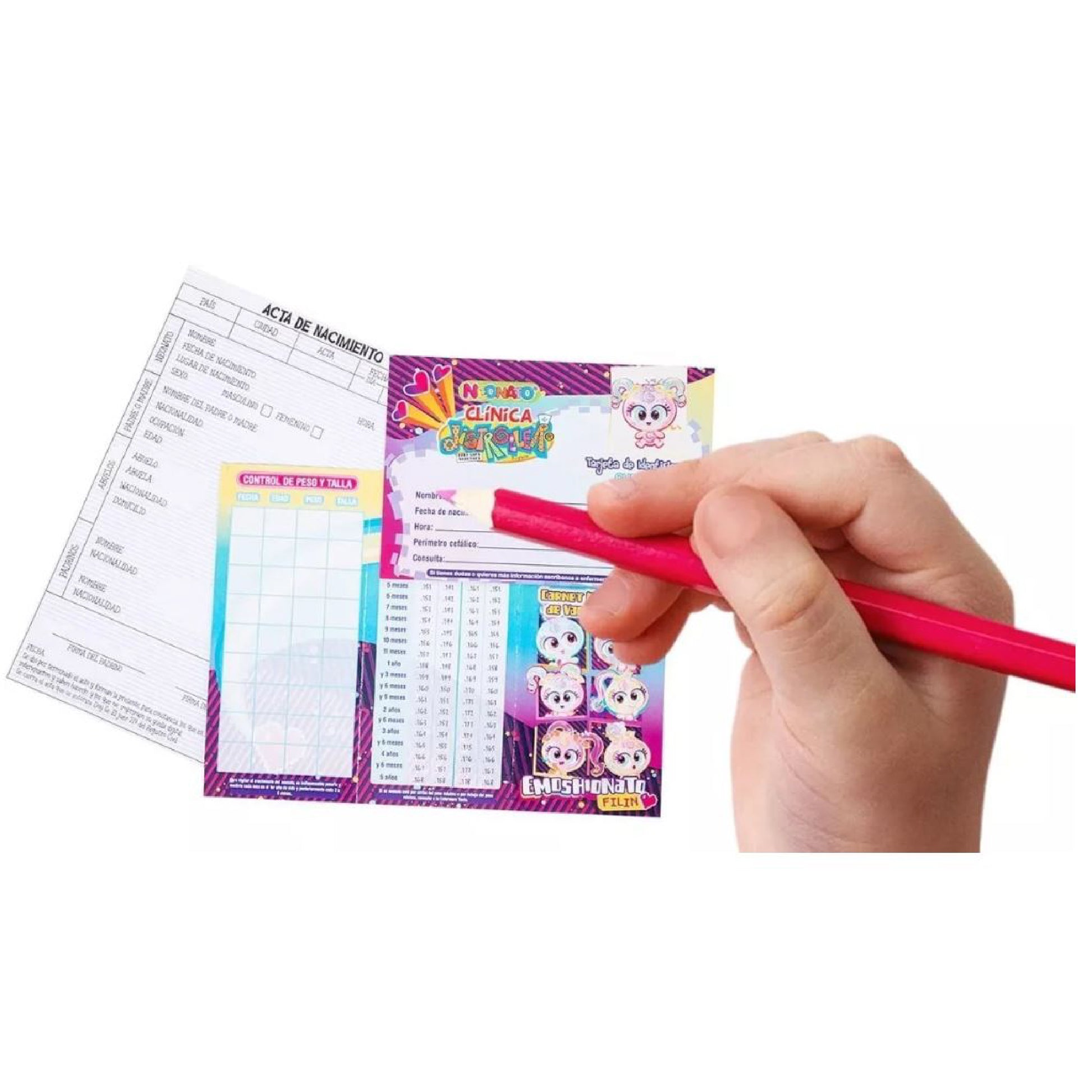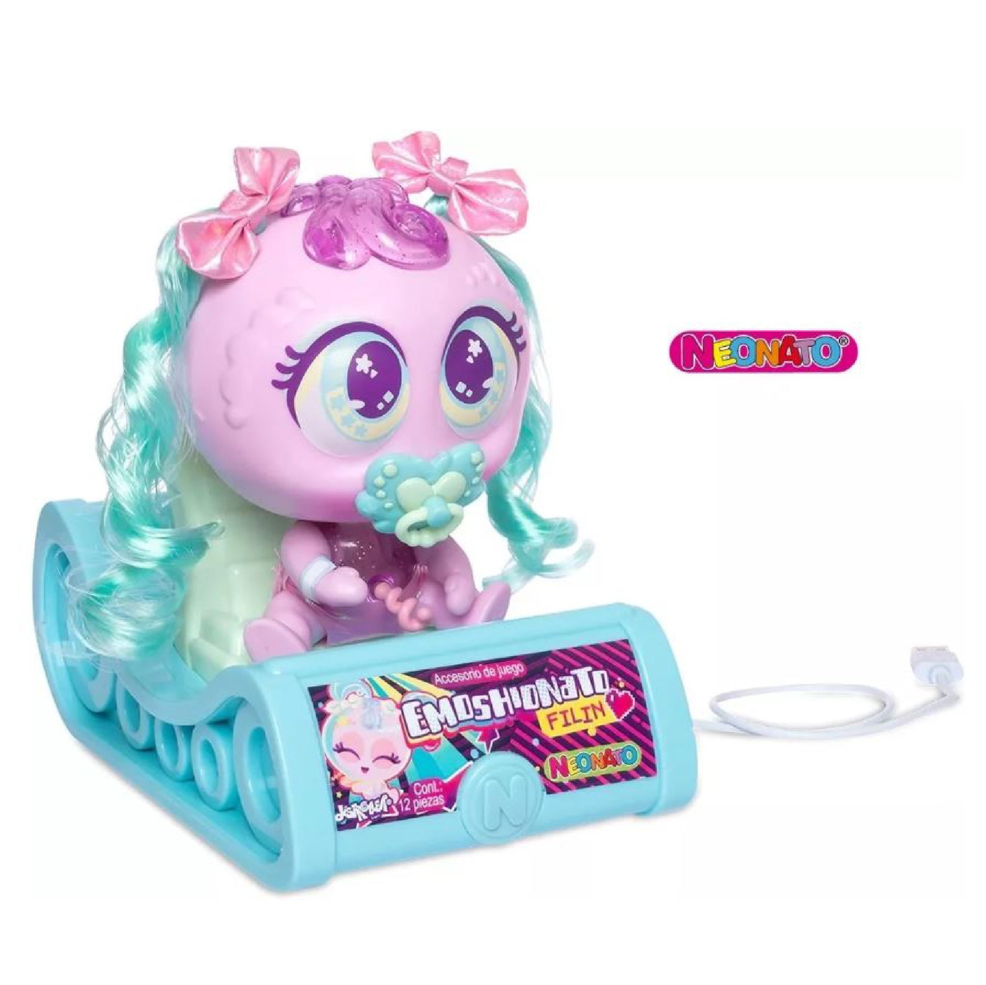- Contenido: 10 piezas, incluyendo muñeco, chupón, pañal, cordón umbilical, carro cargador, acta de nacimiento, cartilla de vacunación, credencial de cunero, fotografía e instructivo de juego