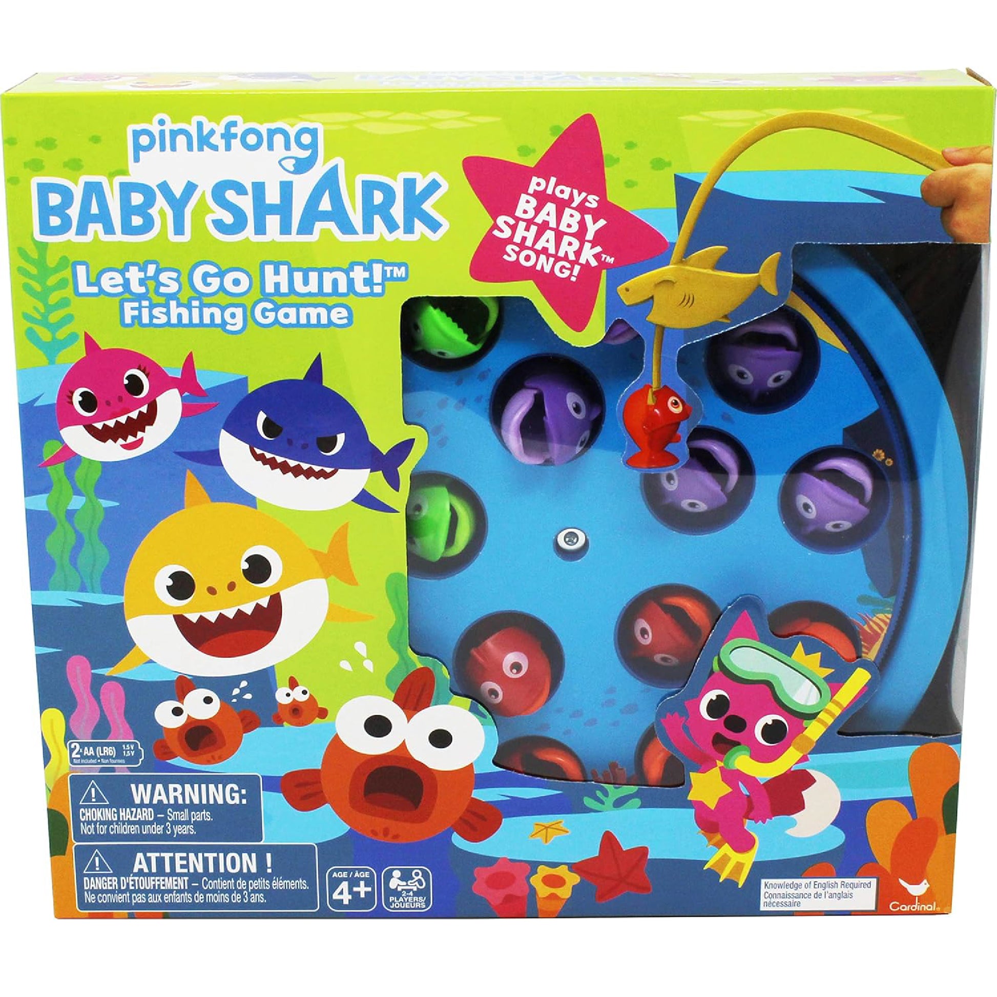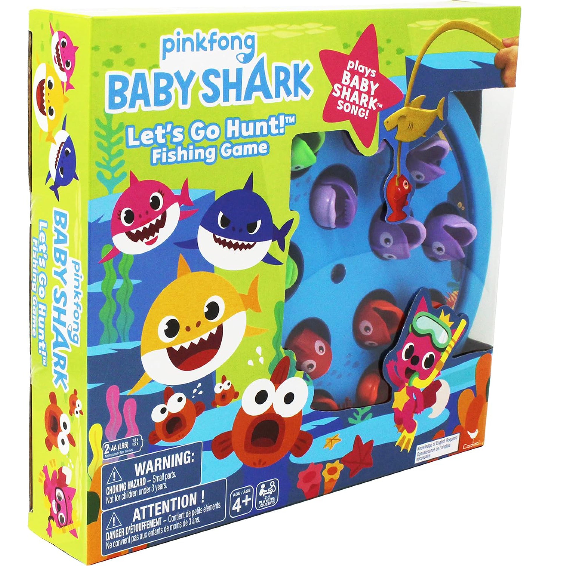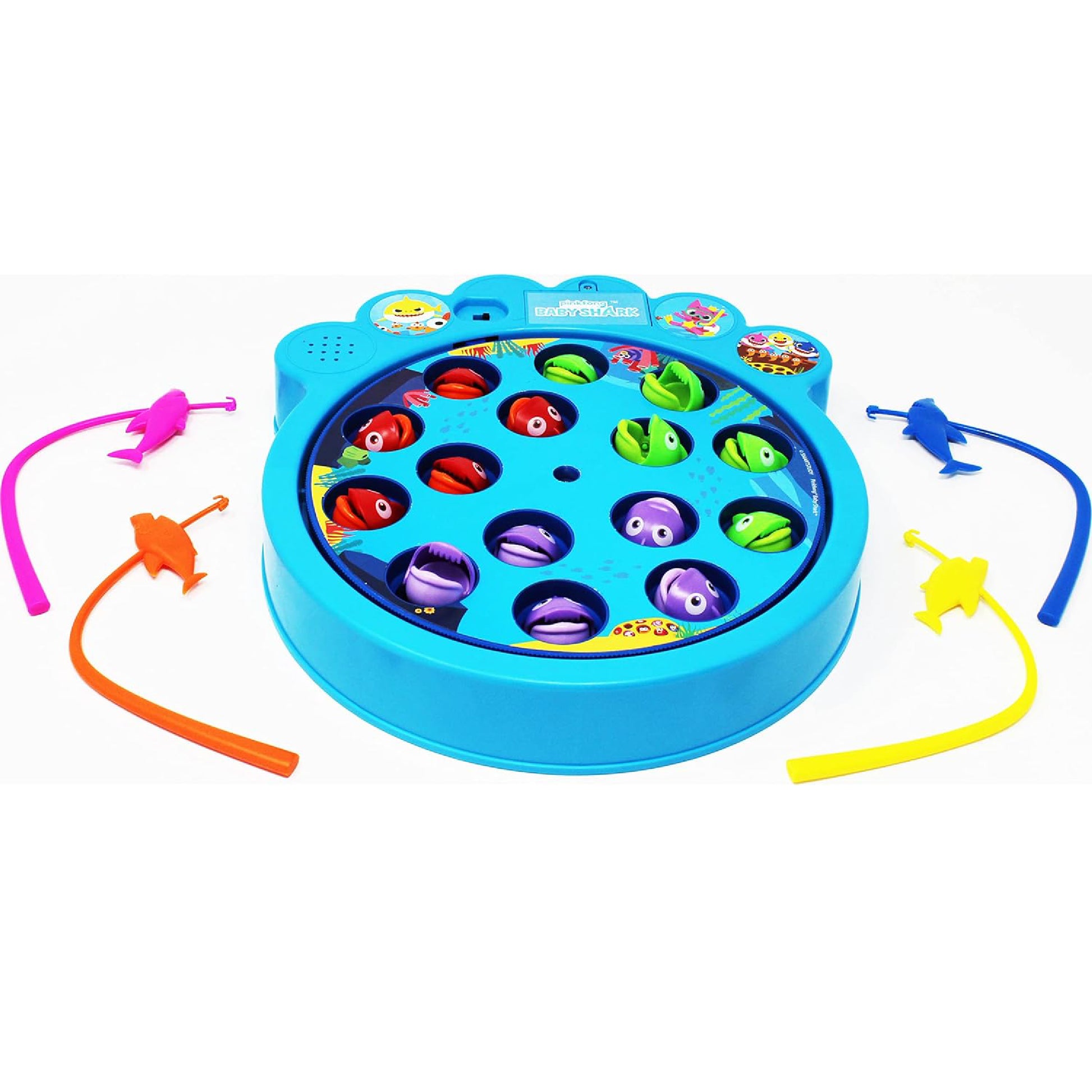 - Reproduce la canción de Baby Shark e incluye: tablero, 4 cañas de pescar, 15 peces e instrucciones.