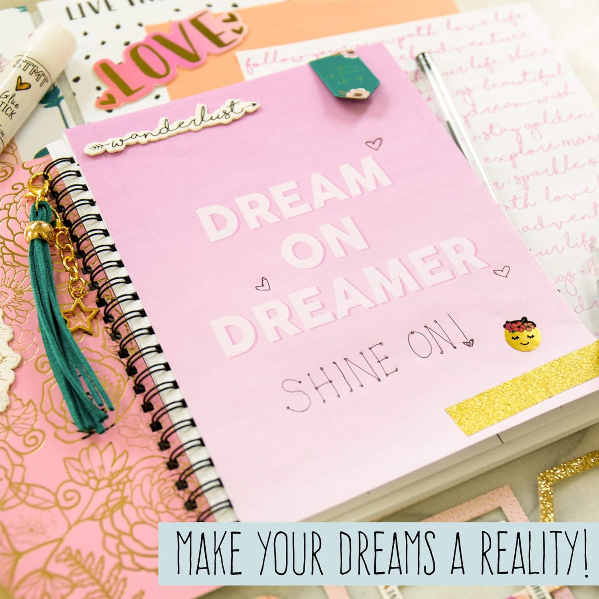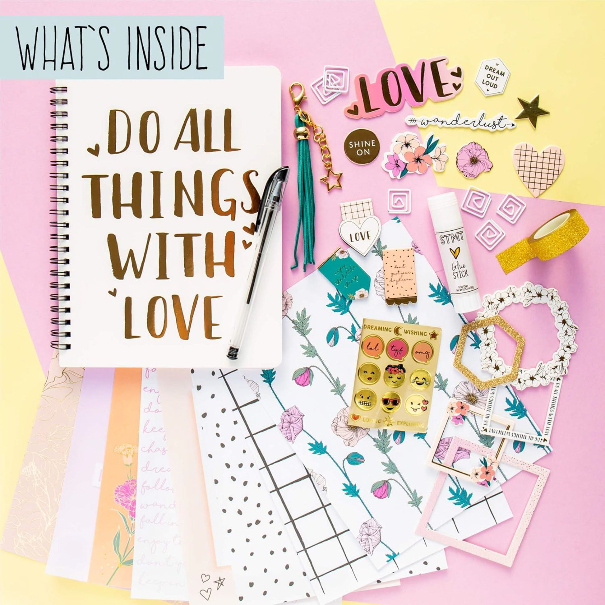 - Incluye: diario (70 hojas), 8 formas troqueladas, 1 hoja de pegatinas, 1 cinta con purpurina, 1 bolígrafo, 6 clips de papel con formas, 3 marcapáginas plegados magnéticos, 5 marcos de aglomerado, 1 llavero con borlas de gamuza sintética, 8 páginas impresas , 1 barra de pegamento, instrucciones fáciles de seguir