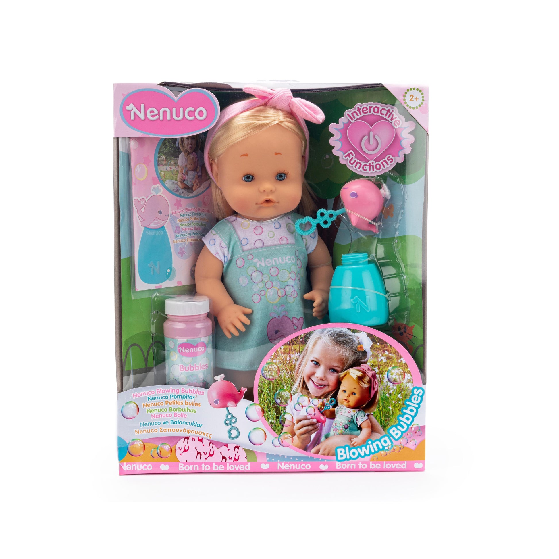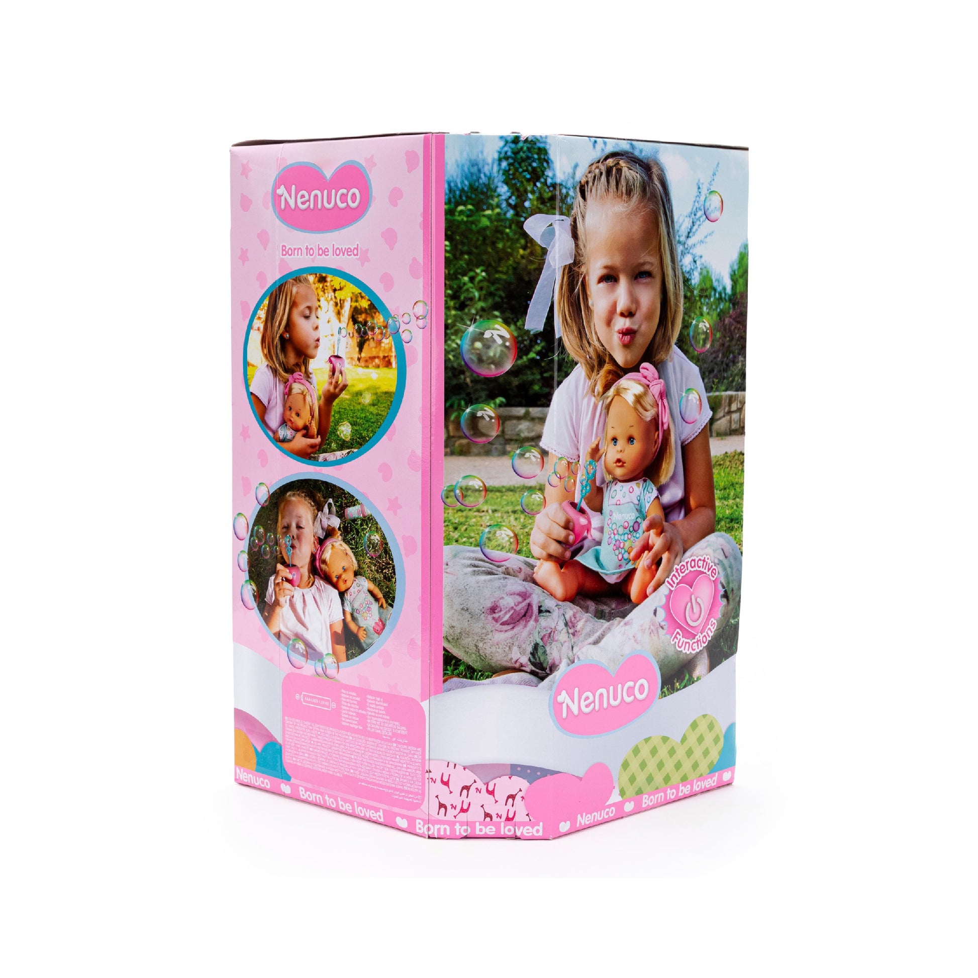 - Nenuco Burbujas es una muñeca de 35 cm con cuerpo duro y un encantador vestido a juego con diadema