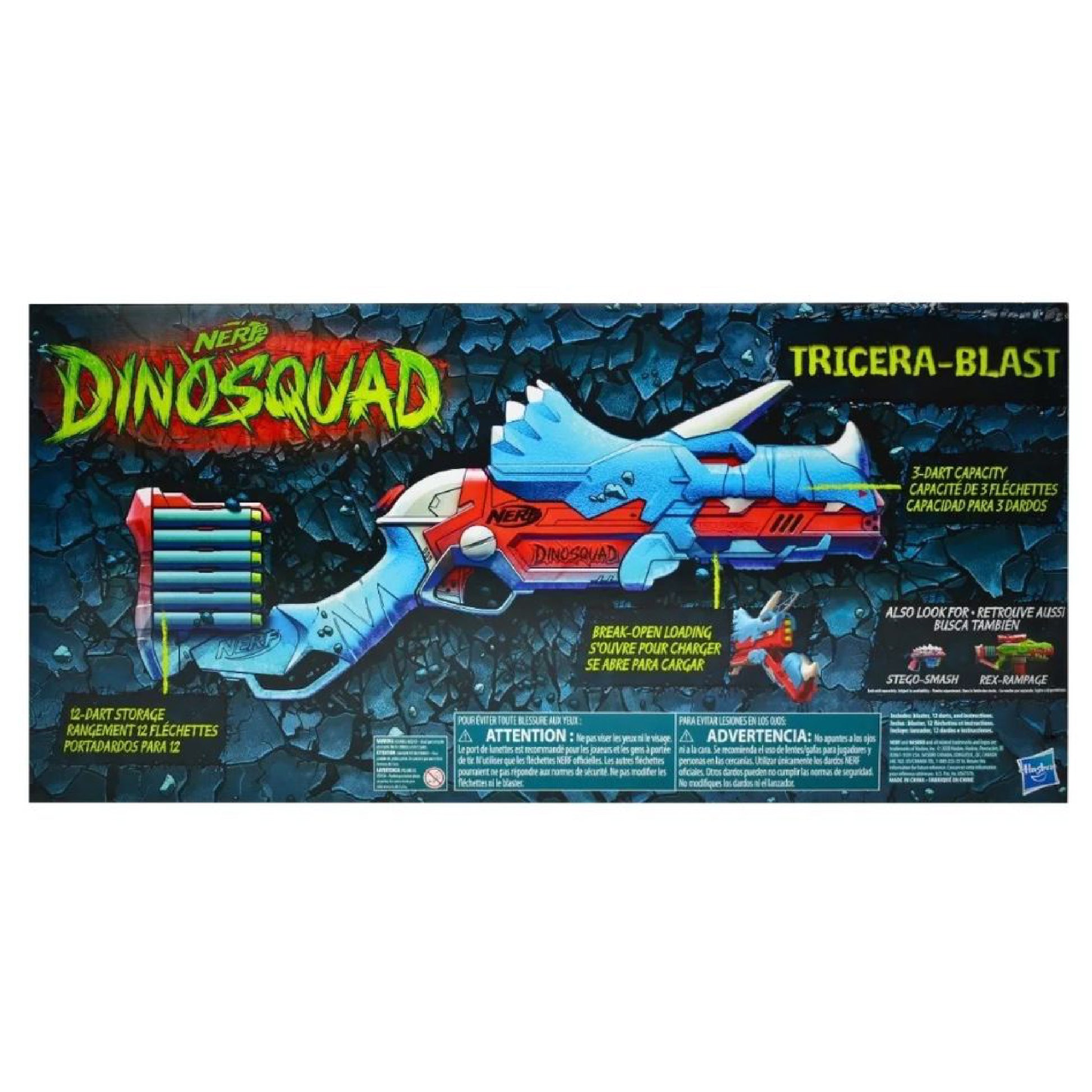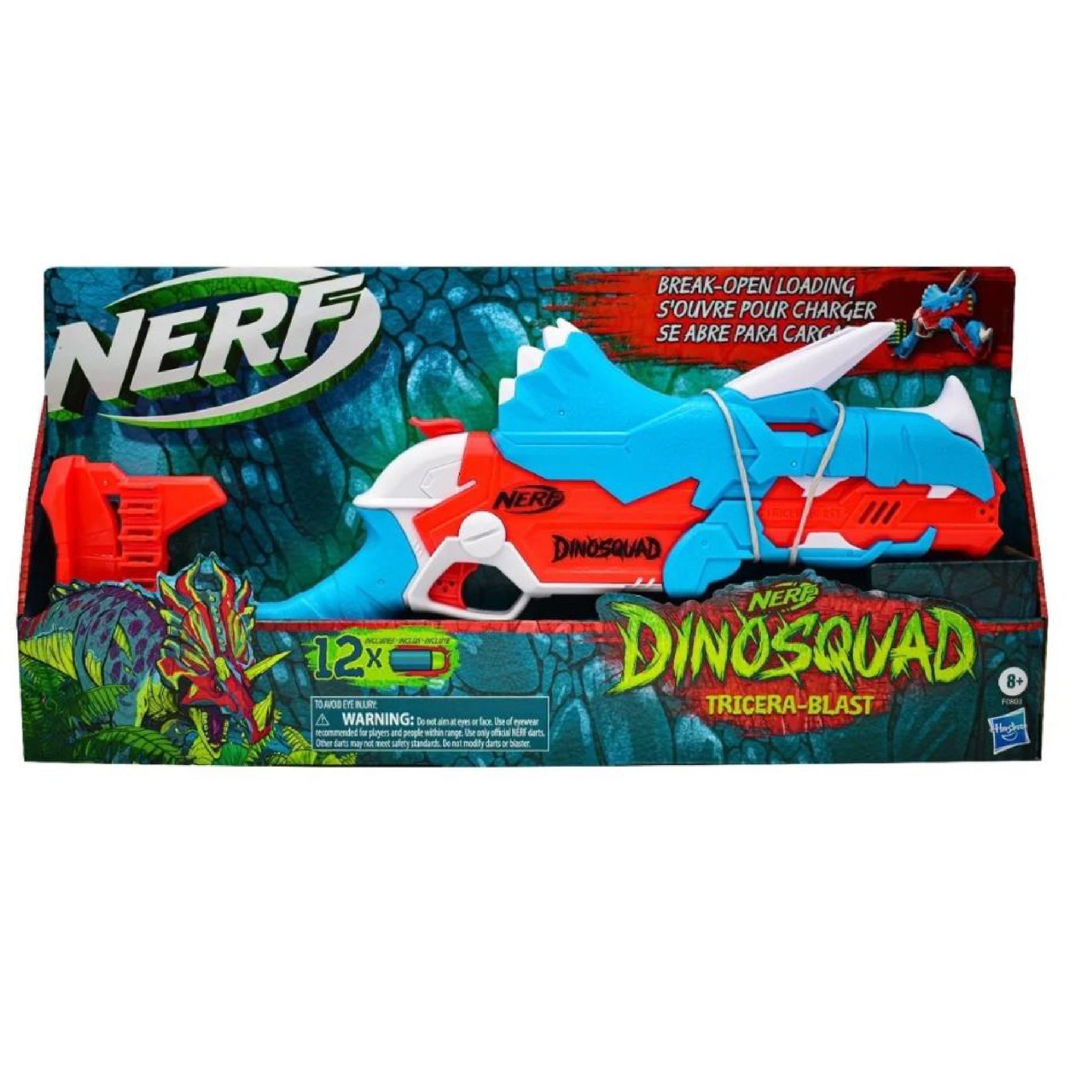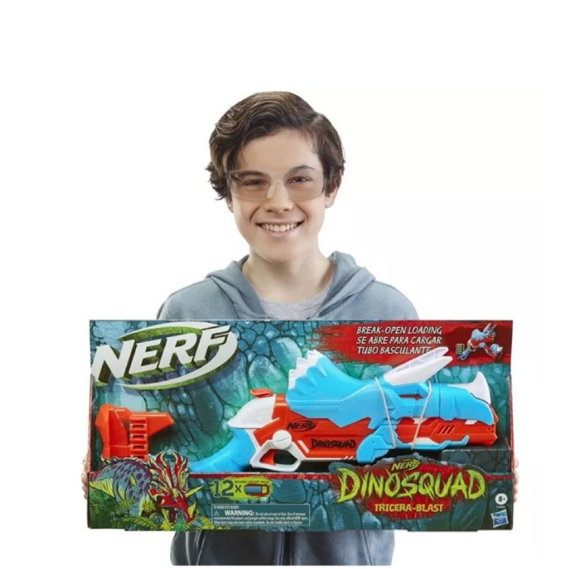 - Incluye el lanzador Nerf DinoSquad Tricer-blast con diseño de Triceratops, carga con apertura y 12 dardos de espuma