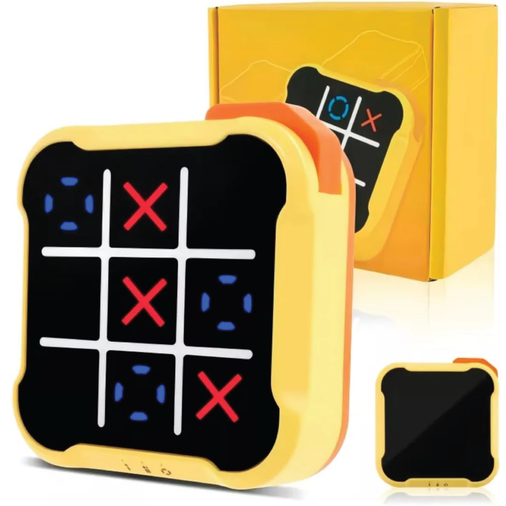 - Juego electrónico de tres en línea con luces interactivas que indican turnos y ganador.