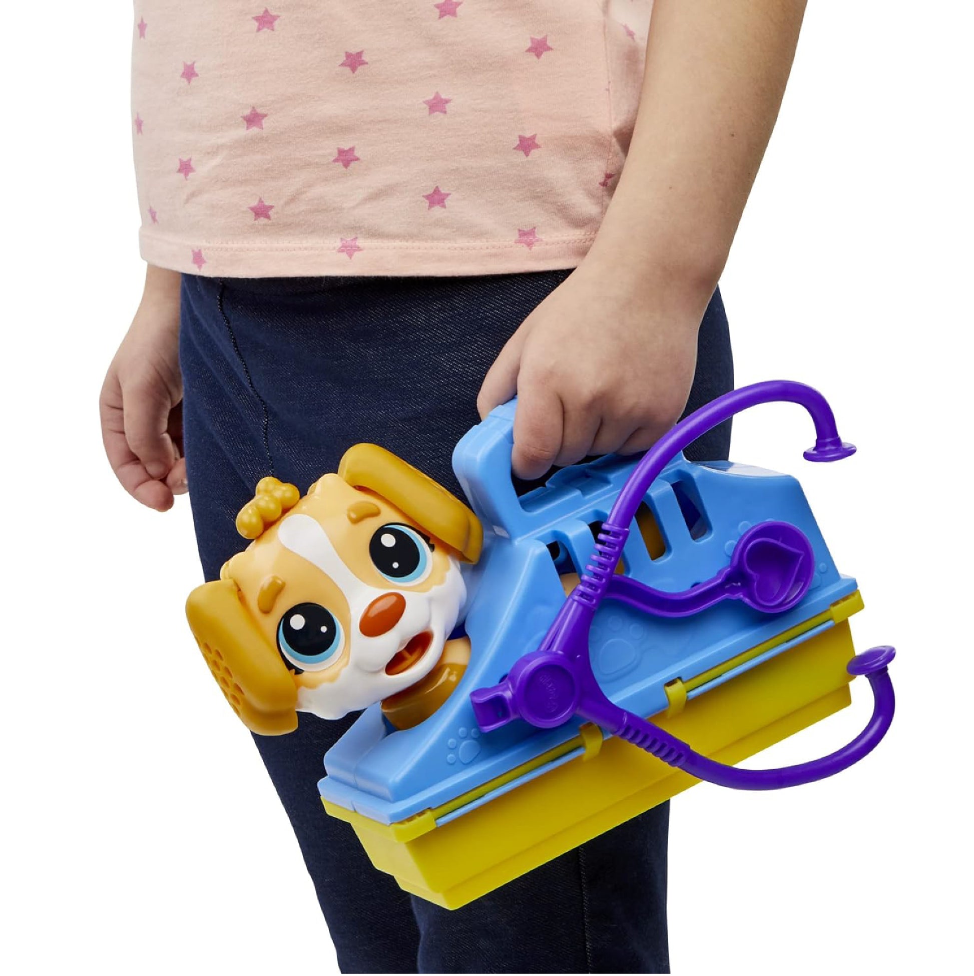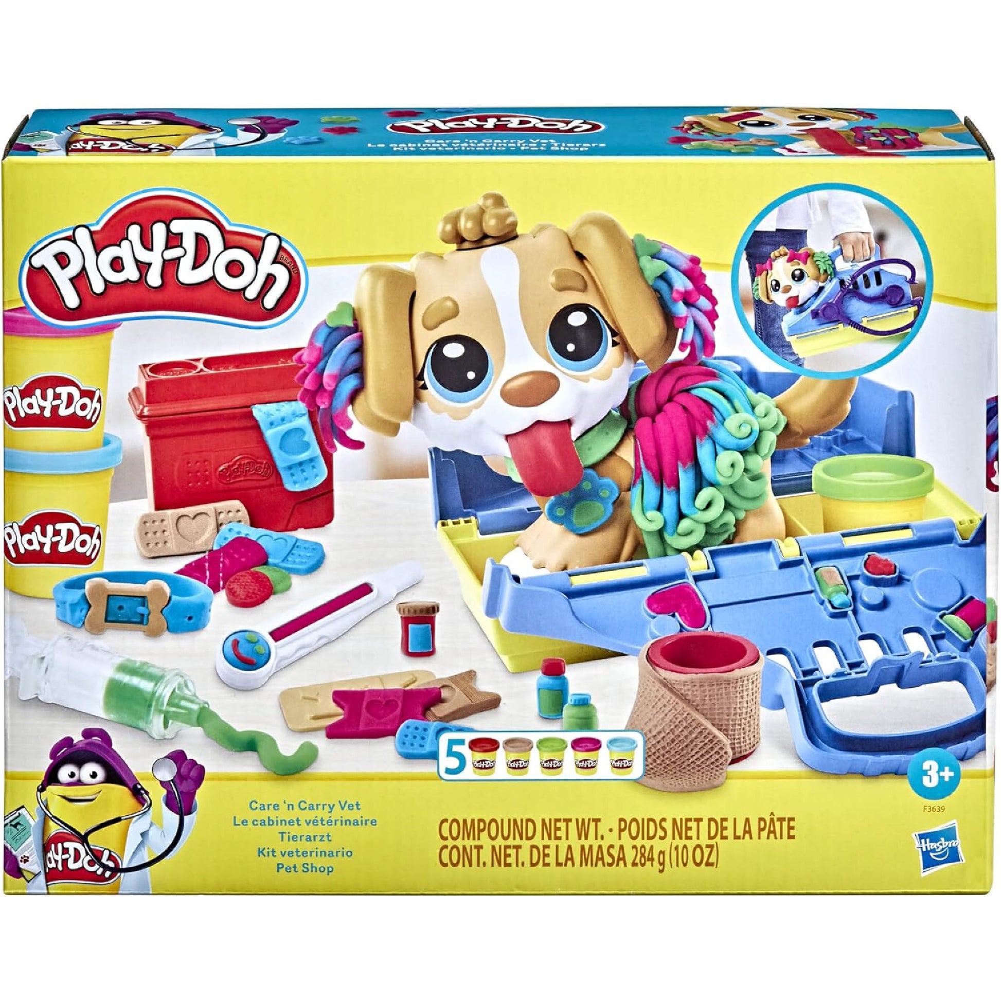 - Incluye 10 herramientas con temática de veterinario, 5 latas de Play-Doh en diferentes colores, y un transportín para transportar a tu mascota y guardar todos tus accesorios