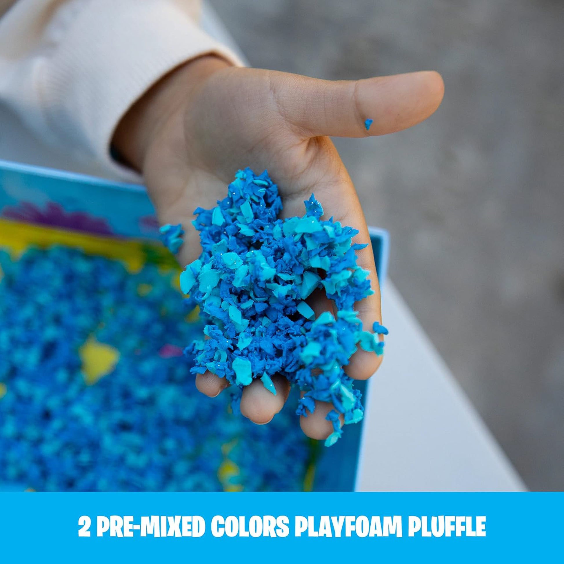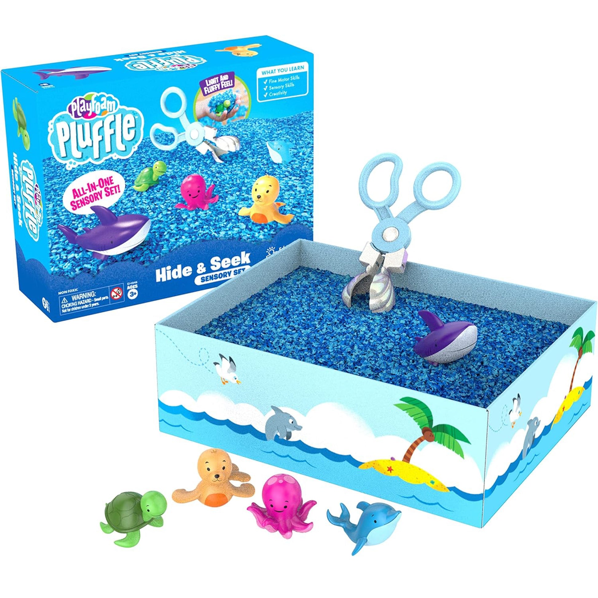- Juego sensorial completo que incluye cubo, Playfoam Pluffle, herramientas y figuras marinas.